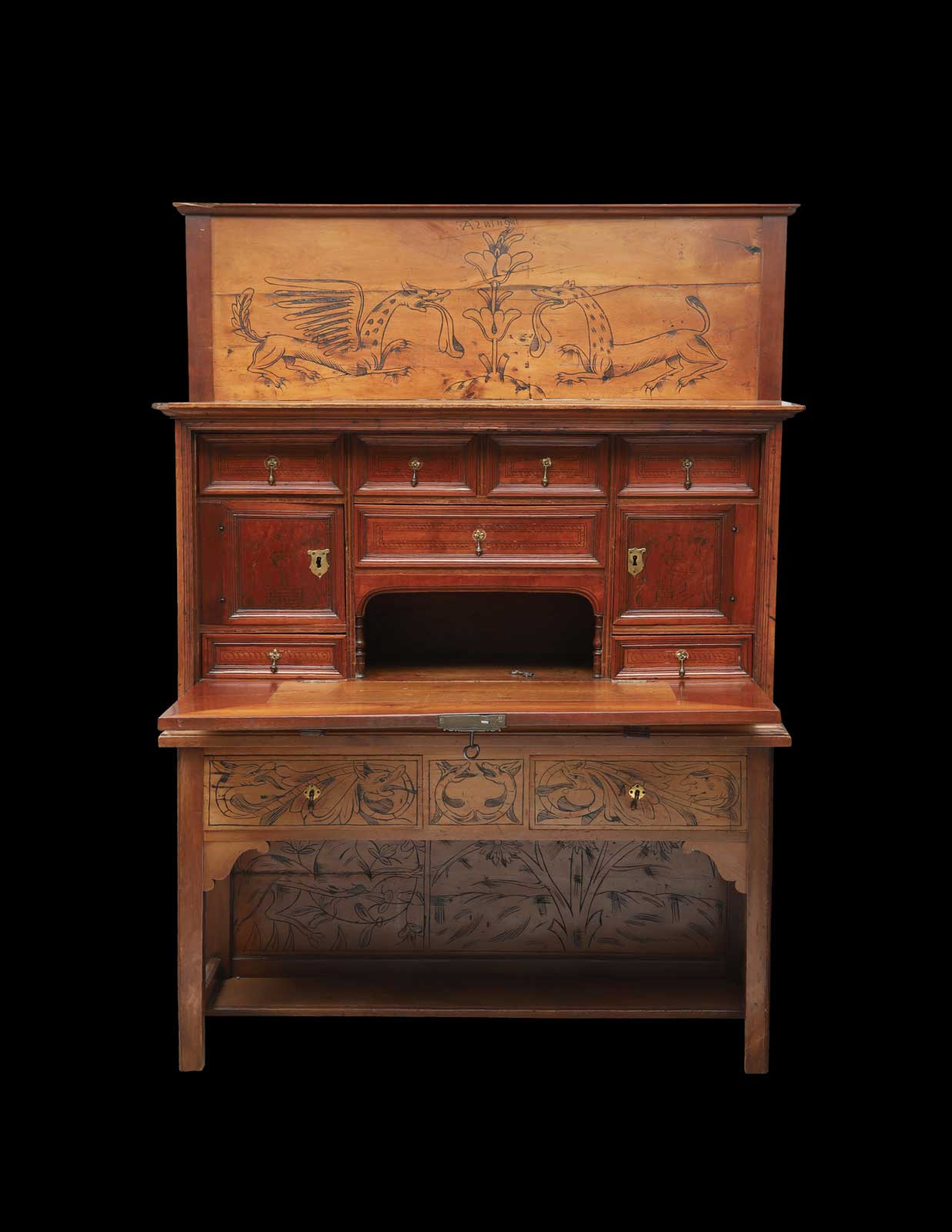 Azorean cabinet in cedar wood, incised decoration with backgrounds filled in black mass with plant motifs, fantastic animals and mythological scenes. Inscription around the cabinet: “He who has given to a worthy man, receives a benefit from giving.” Azores, Portugal 16th/17th Century