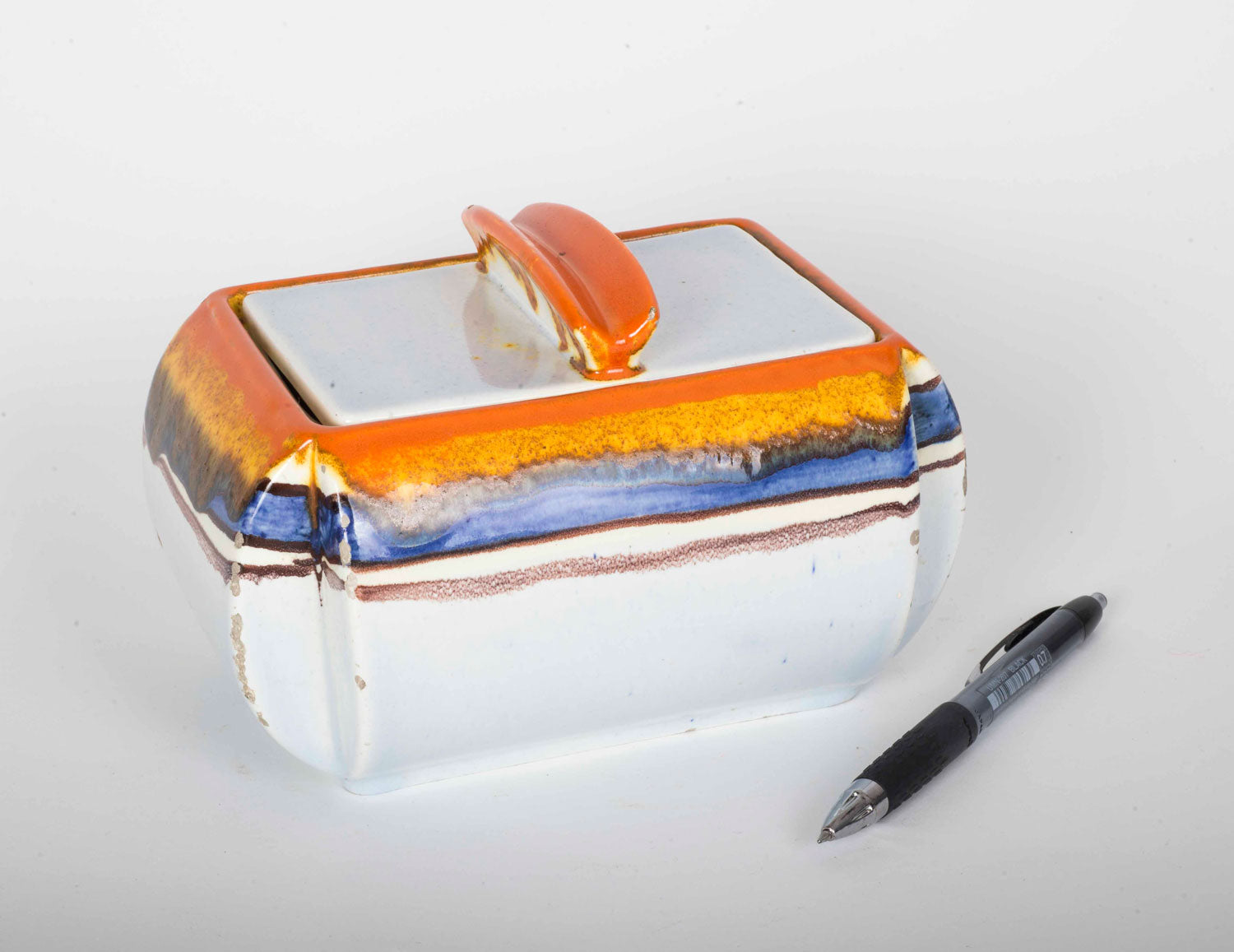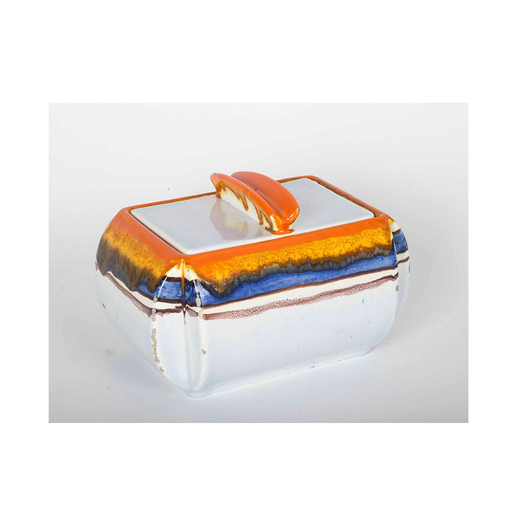 White, blue and orange Schramberg Majolika ceramic container with lid.