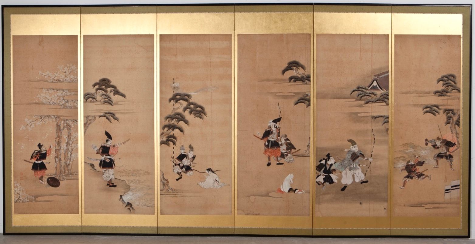 Folding screen with 6 leaves painted on paper with ink, watercolor and gouache, depicting landscape scenes, architecture and characters. Meiji period. 19th century