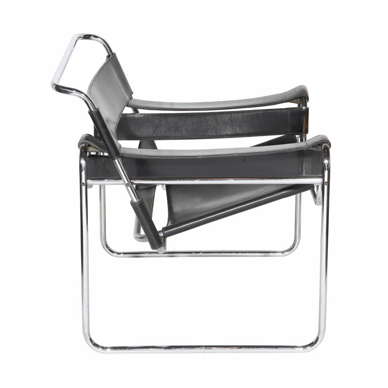 Wassily chair, also known as the B3 Chair, designed by Marcel Breuer. This iconic armchair in leather and steel was designed in 1925 while Marcel Breuer was working at the Bauhaus. Among other aspects the design was revolutionary because an extremely practical and innovative material was used in it: the bent steel tube.