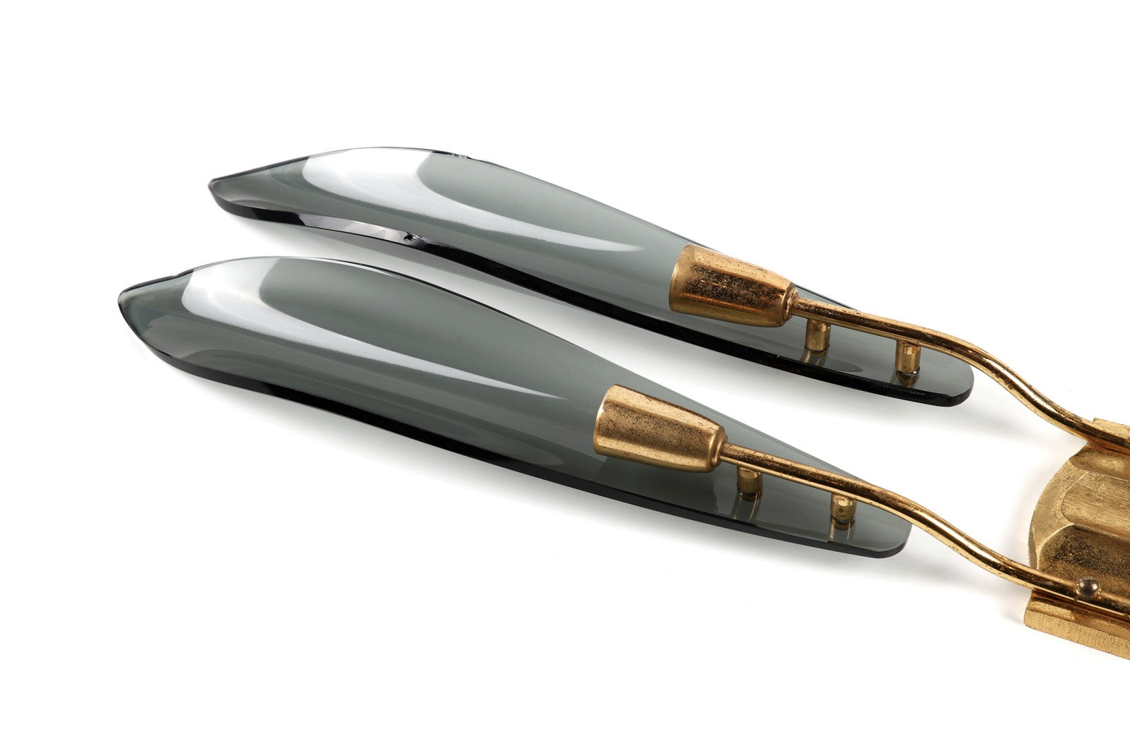 Pair of double lights in brass and black glass in Max Ingrand style. 1960s, Italy.