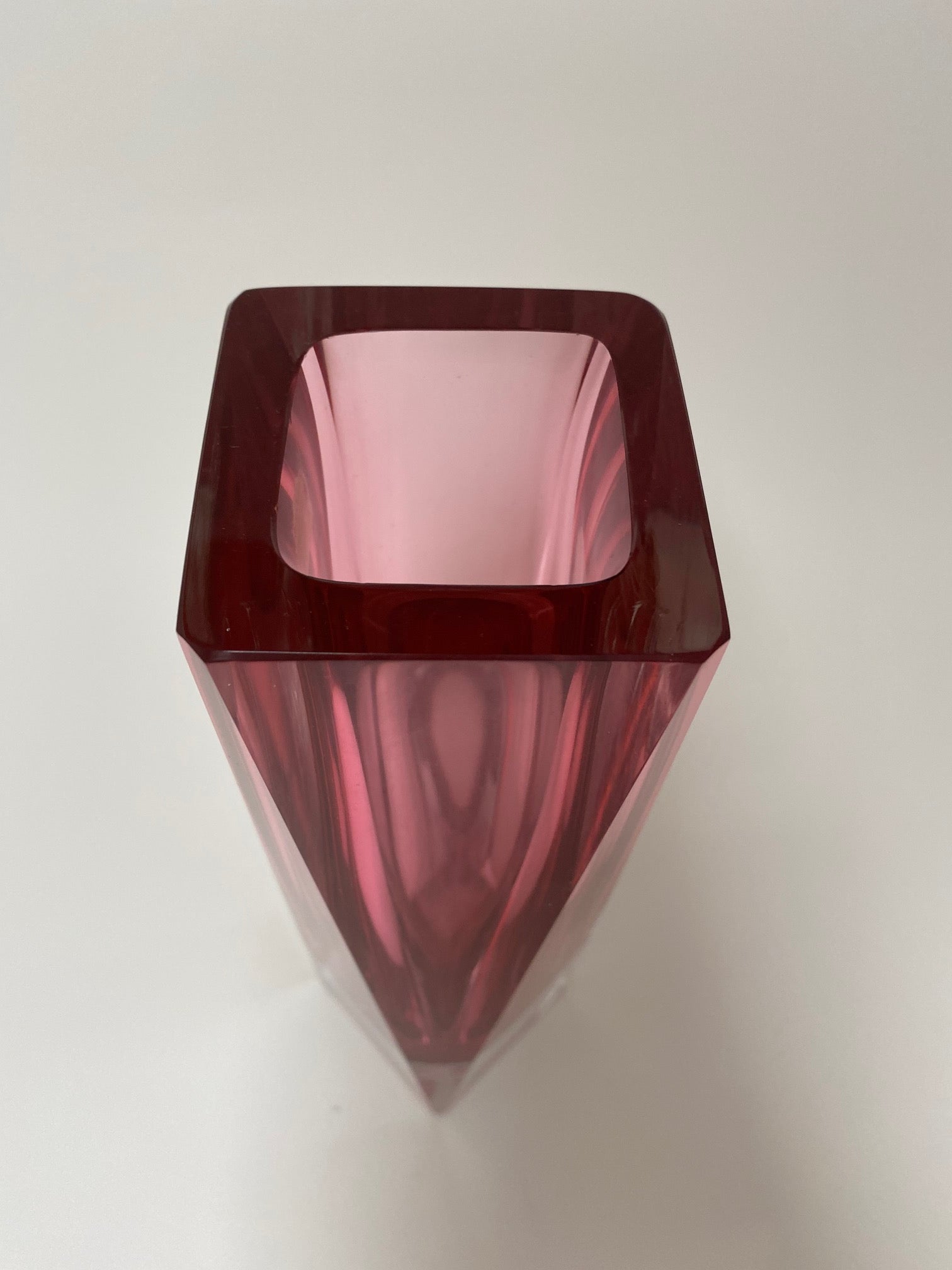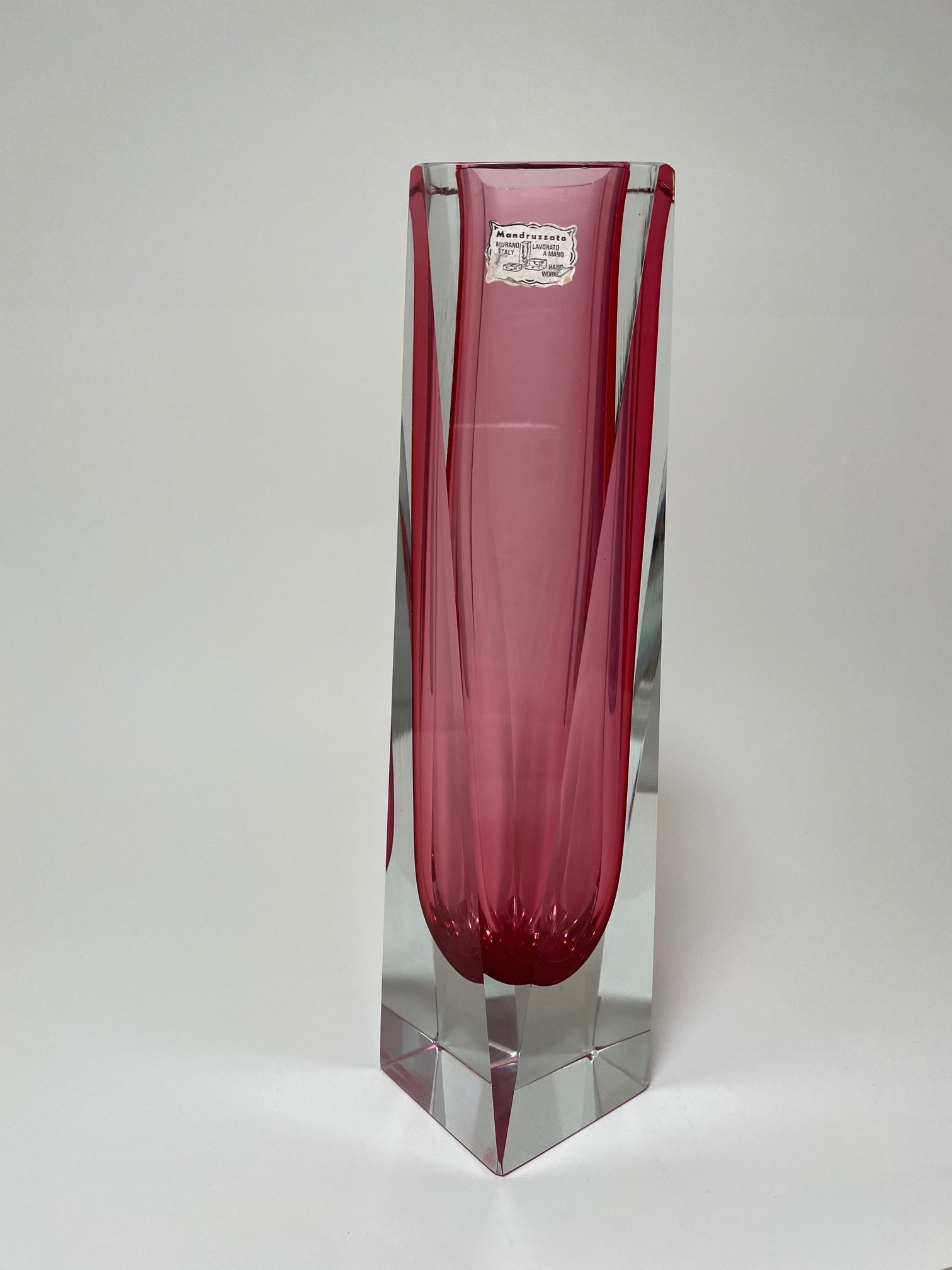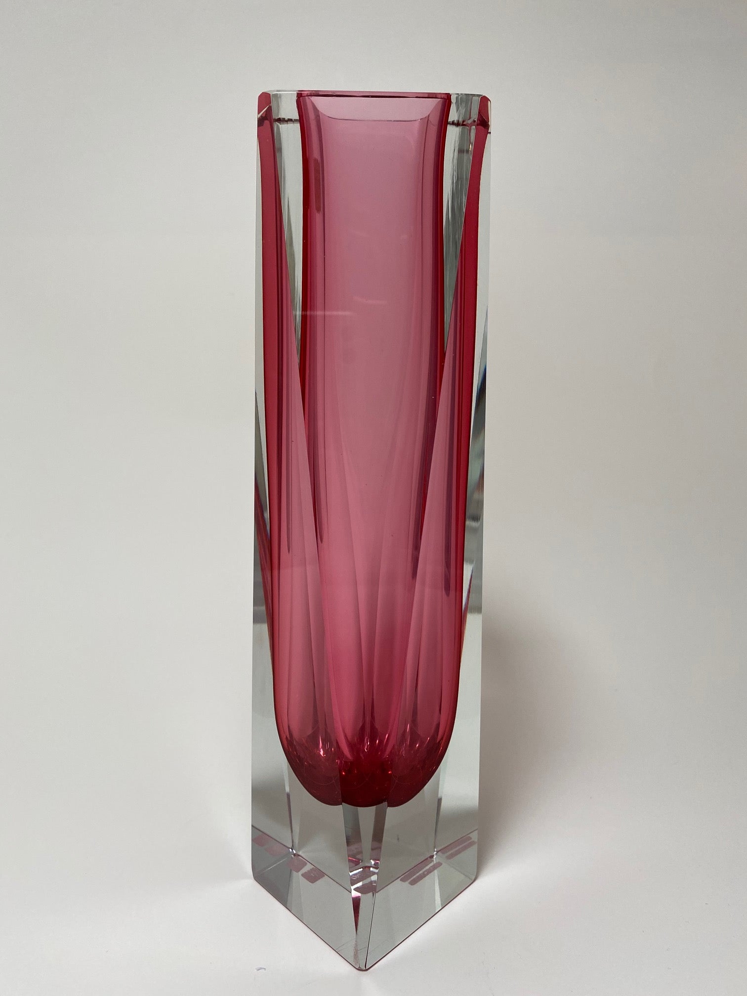 An amazing Venetian Sommerso Murano glass Mid-Century Modern by Flovio Poli for Alessandro Mandruzzato vase made in Italy, 1960s. This is a heavy glass block vase. Pink inside within clear. The top of the vase is flat cut.
