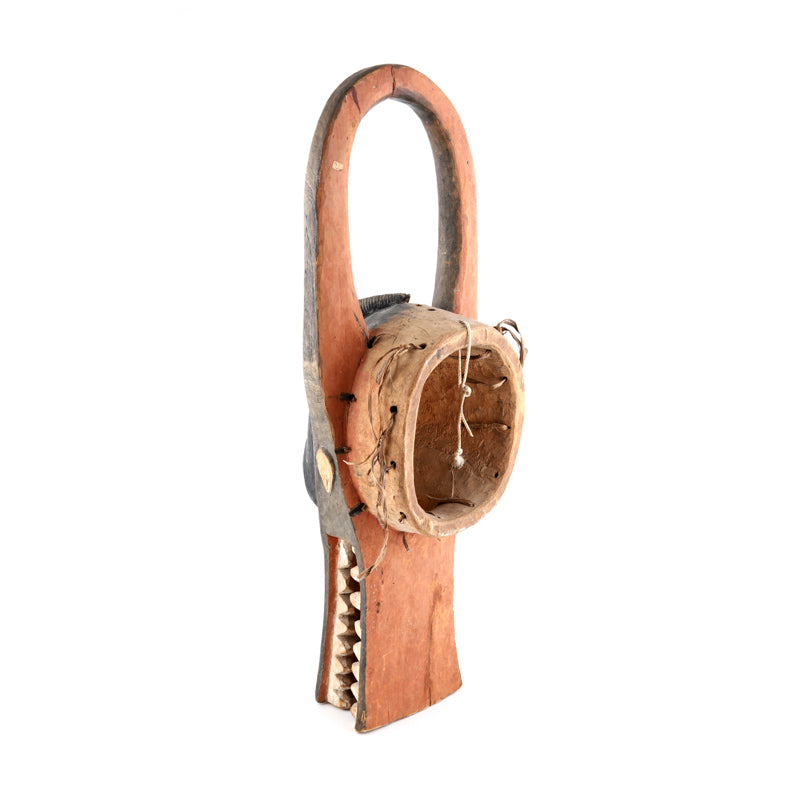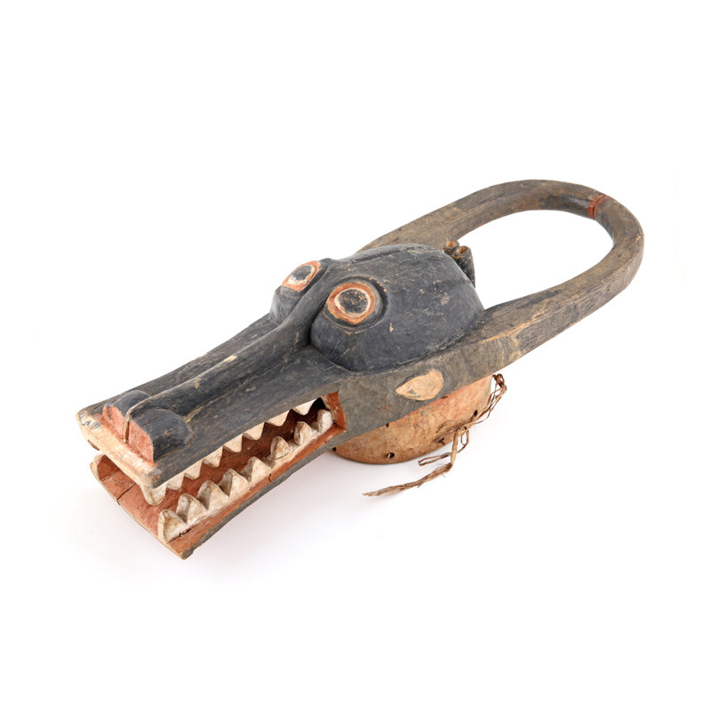 Distintiva máscara capacete de conjuração em forma de crocodilo (bonu amuin) da etnia Senoufo. Costa do Marfim, África Ocidental, final do século XIX. Um ótimo complemento para qualquer coleção de máscaras africanas ou uma fantástica peça de destaque por si só.