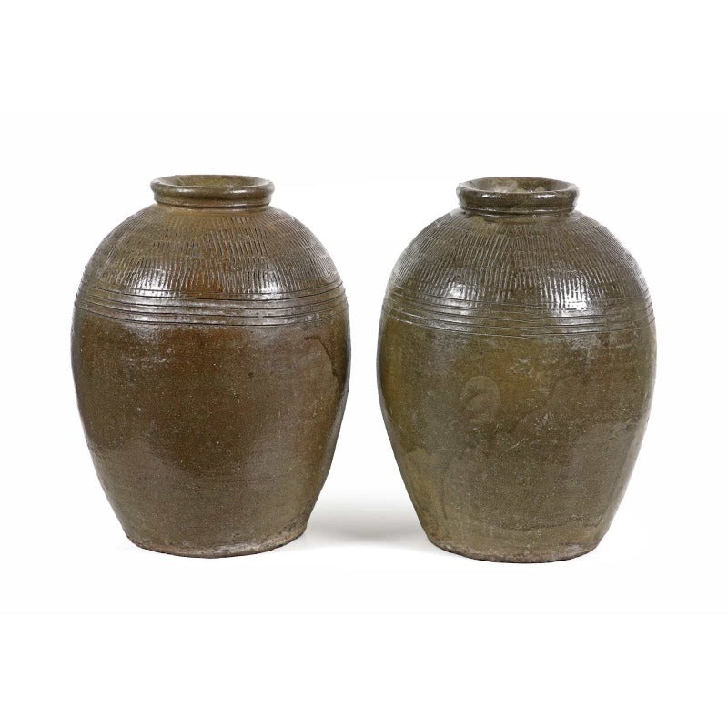 Este par de potes de cerâmica chinesa do final do séc. XIX foi outrora utilizado para conserva de alimentos. Apresenta um acabamento verde e uma superfície exterior com textura canelada. As suas imperfeições e envelhecimento ao longo dos anos são um contributo para o seu apelo.