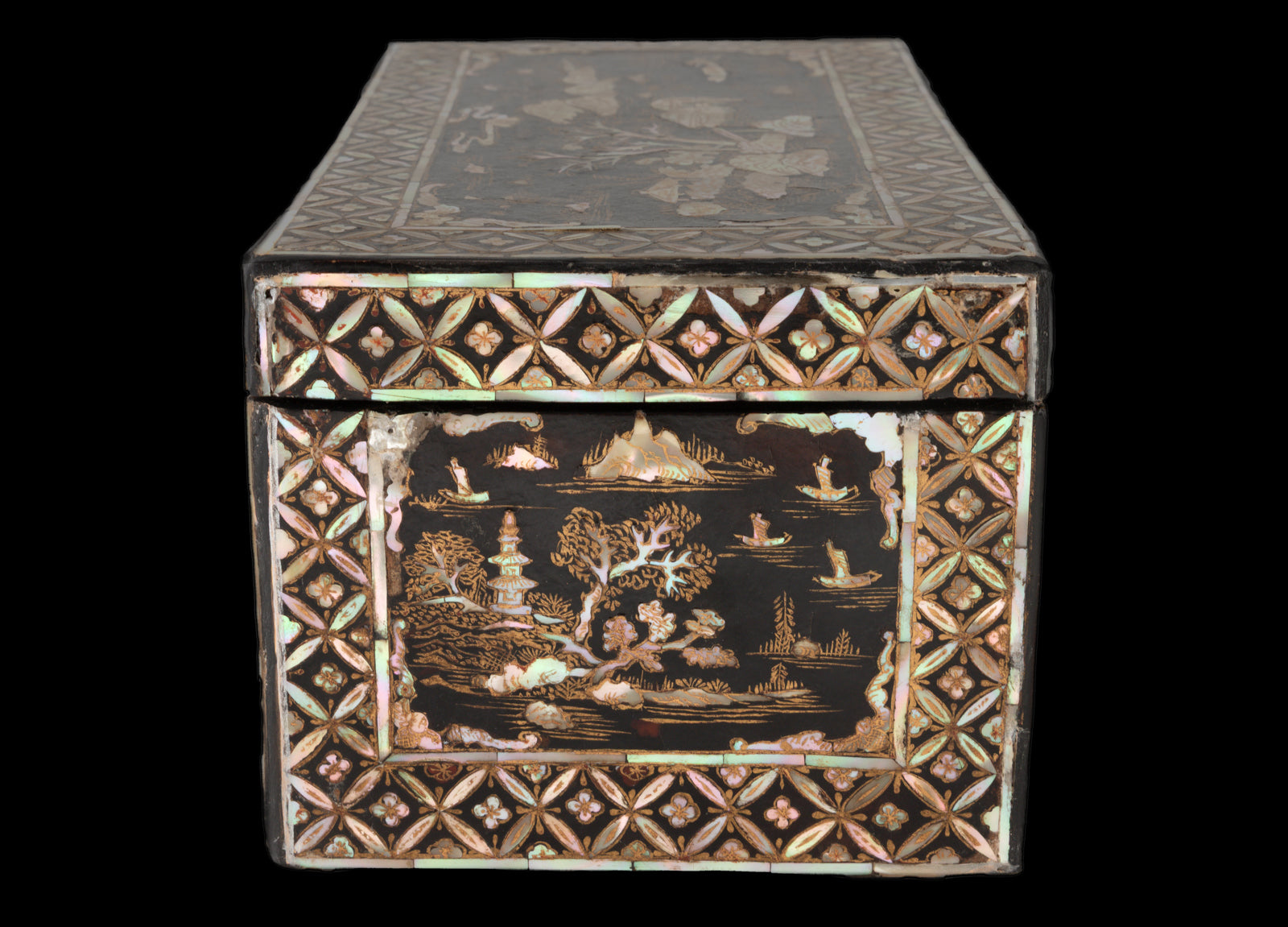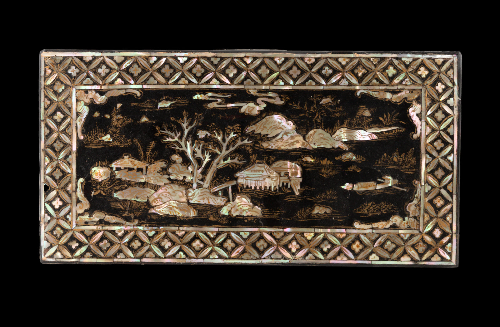 A peça é enquadrada por um elaborado motivo geométrico com incrustações de madrepérola. A estrutura é em madeira lacada, com fechadura e ferragens em metal.