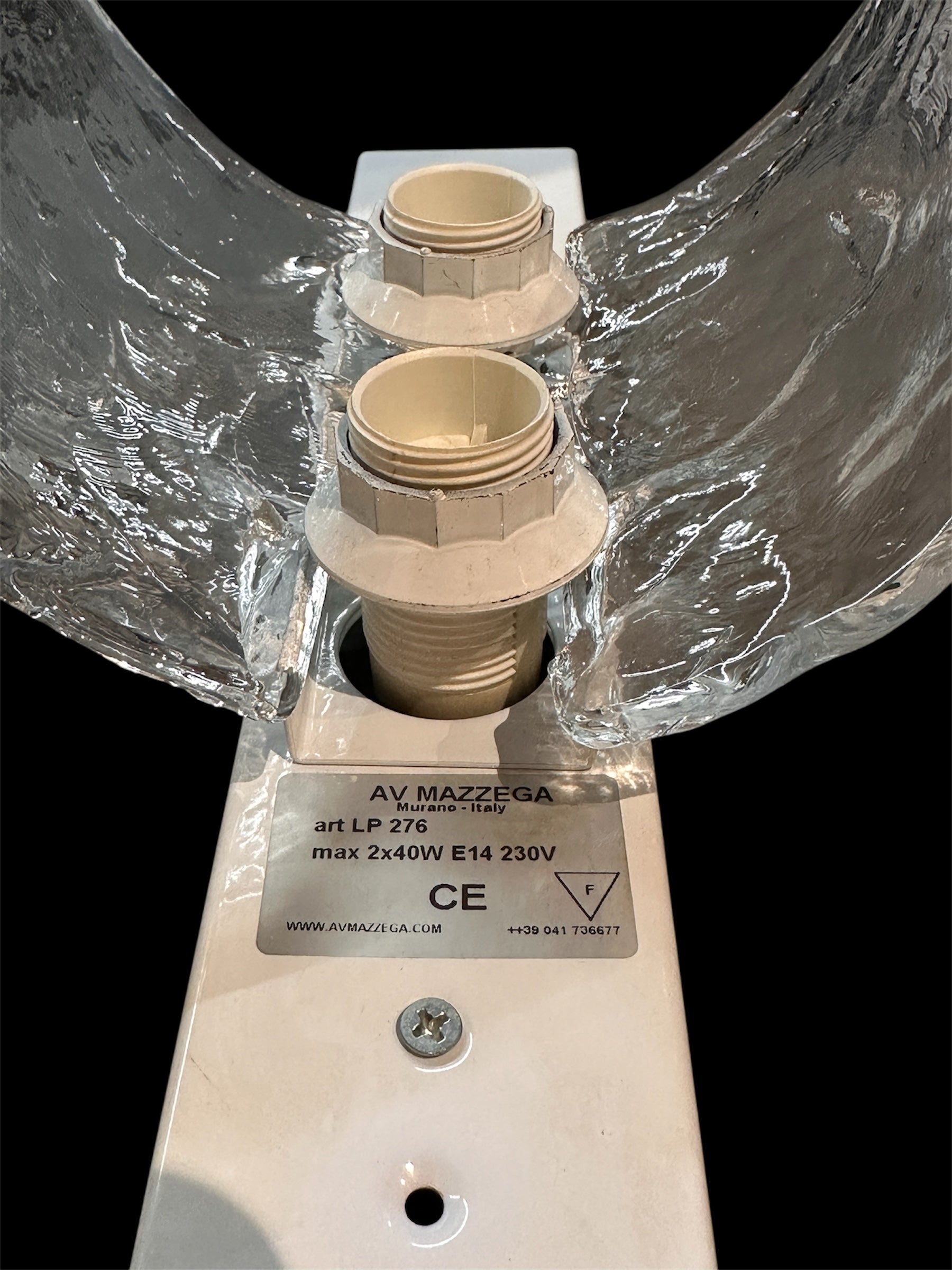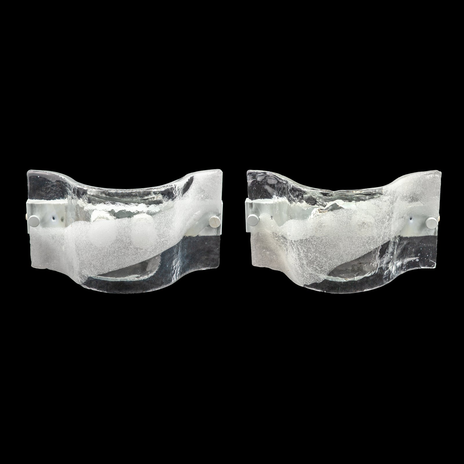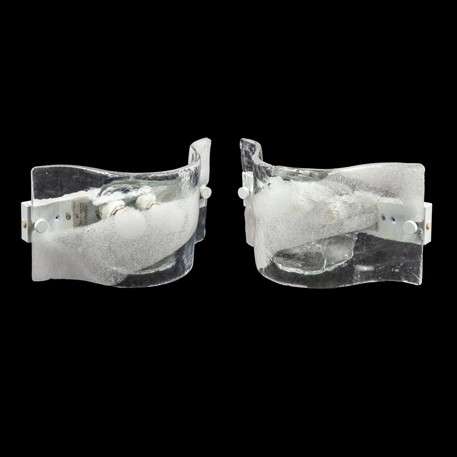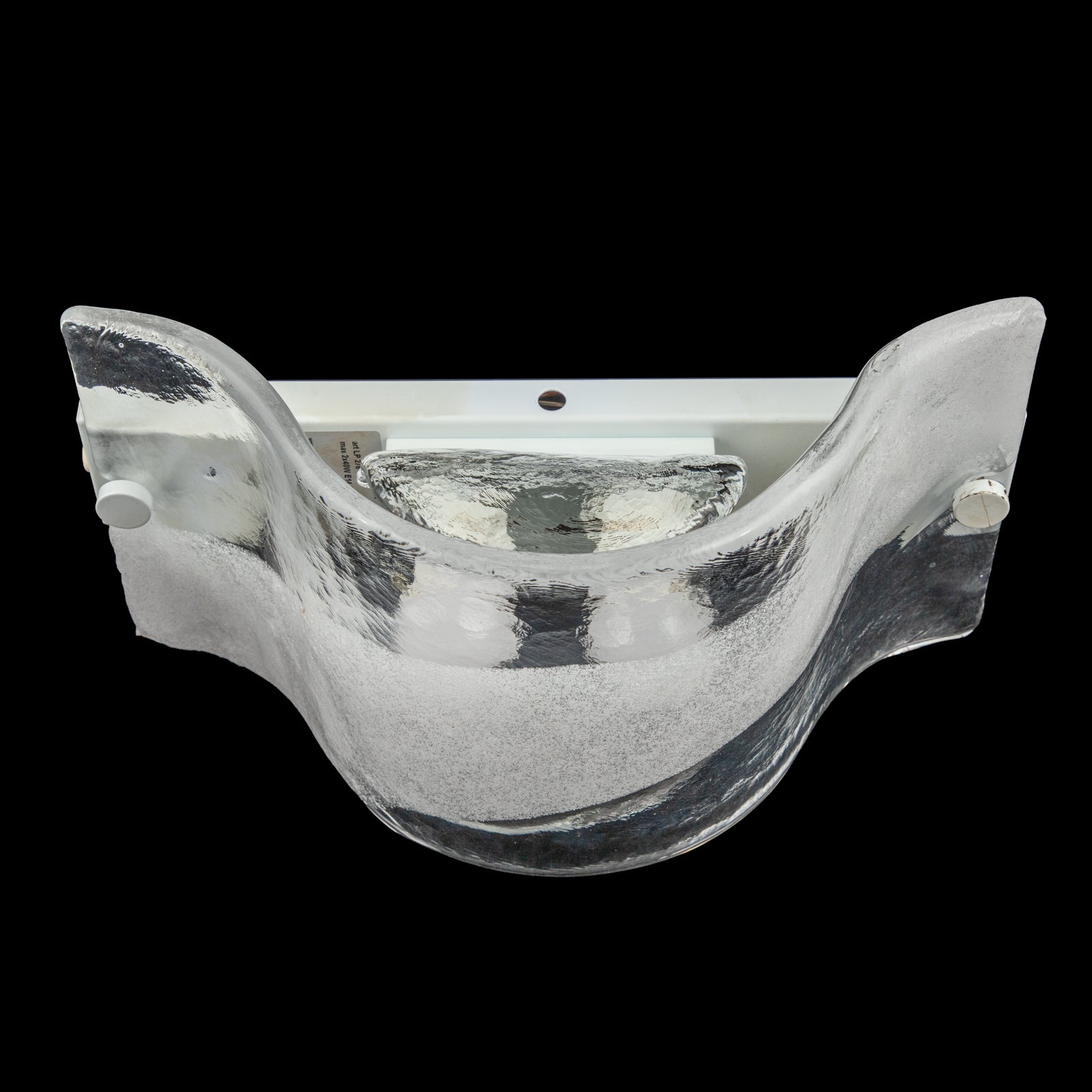 Candeeiro de parede atribuído a Carlo Nason para a AV Mazzega, produzido em vidro soprado de Murano (Itália). Modelo LP 276. Vidro transparente com áreas acetinadas sobre estrutura metálica branca, com espaço para 2 lâmpadas E14.