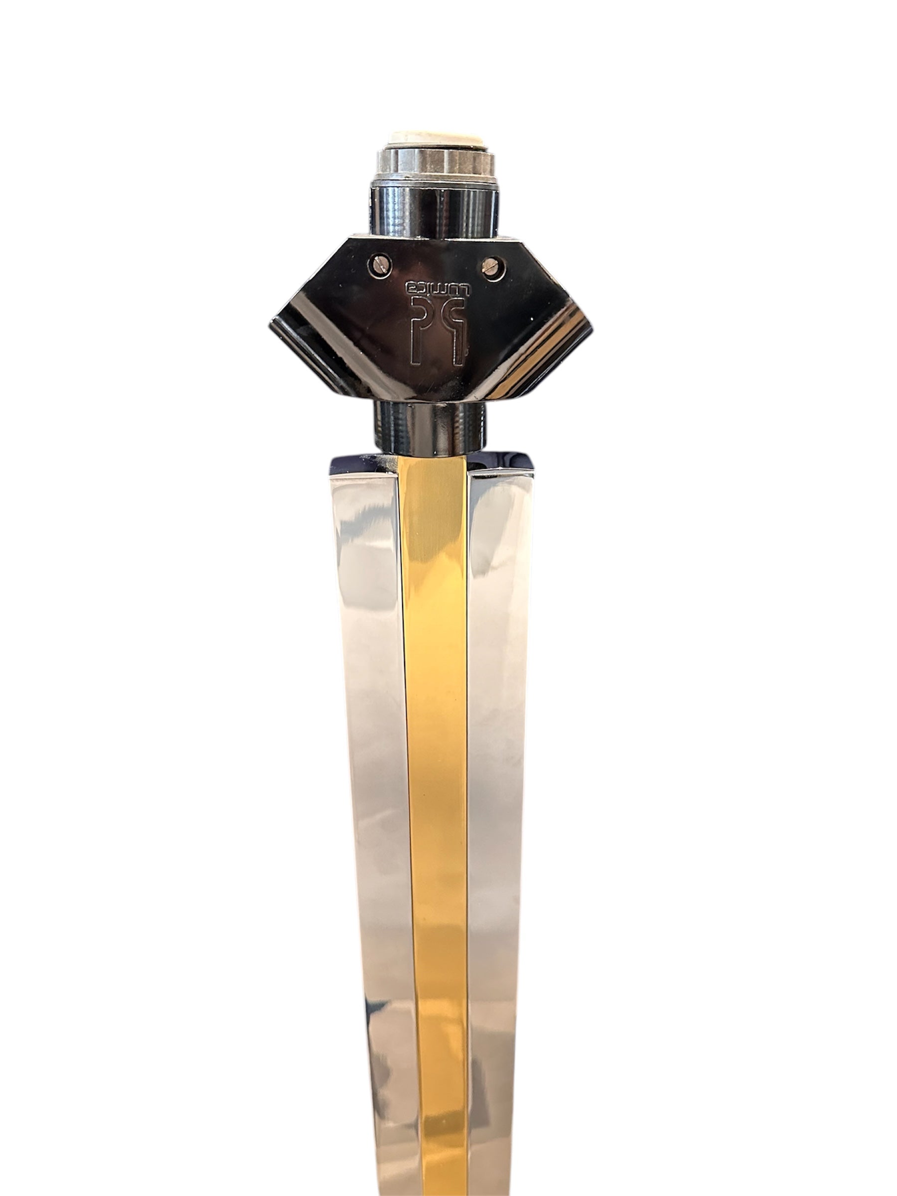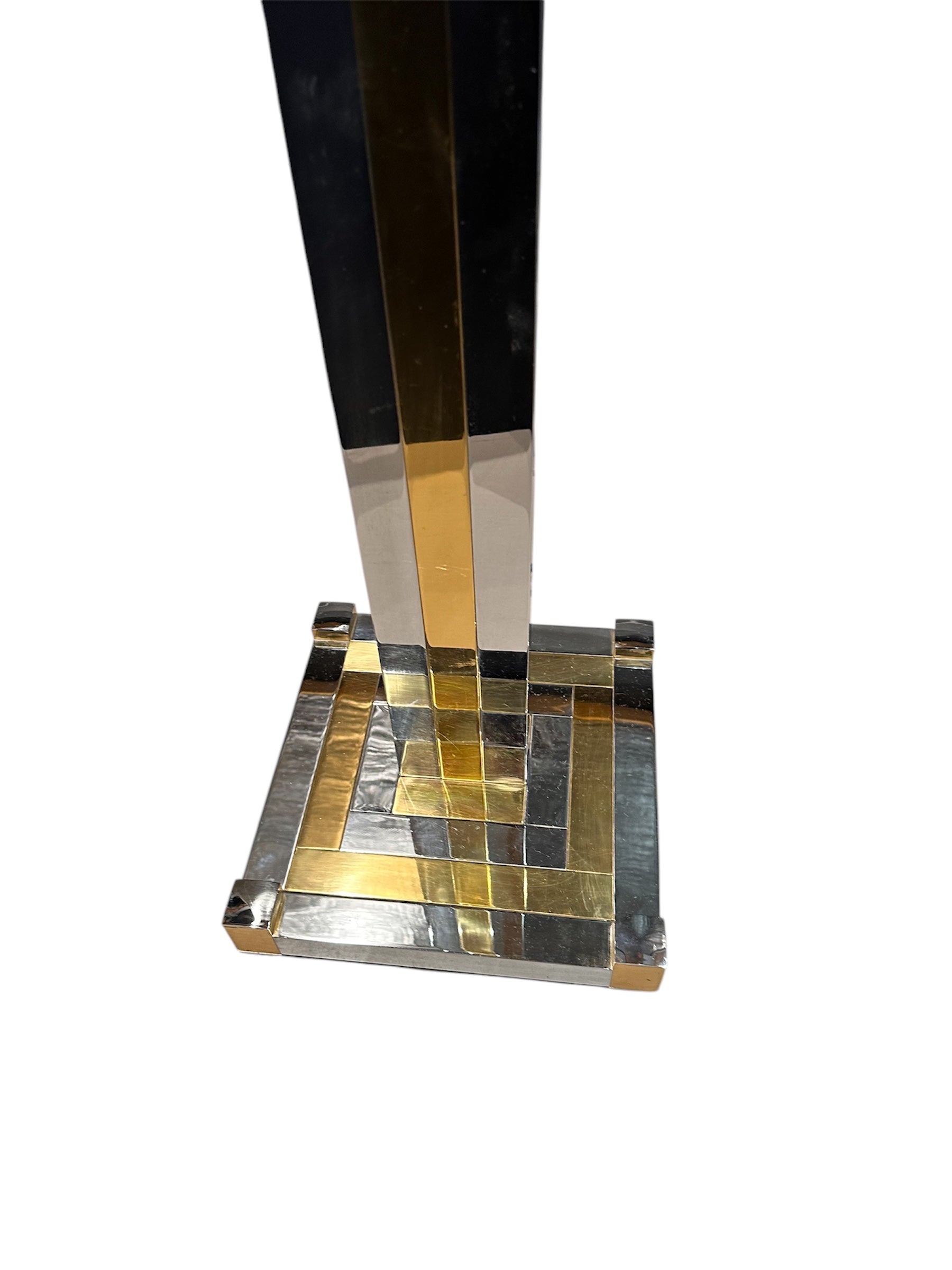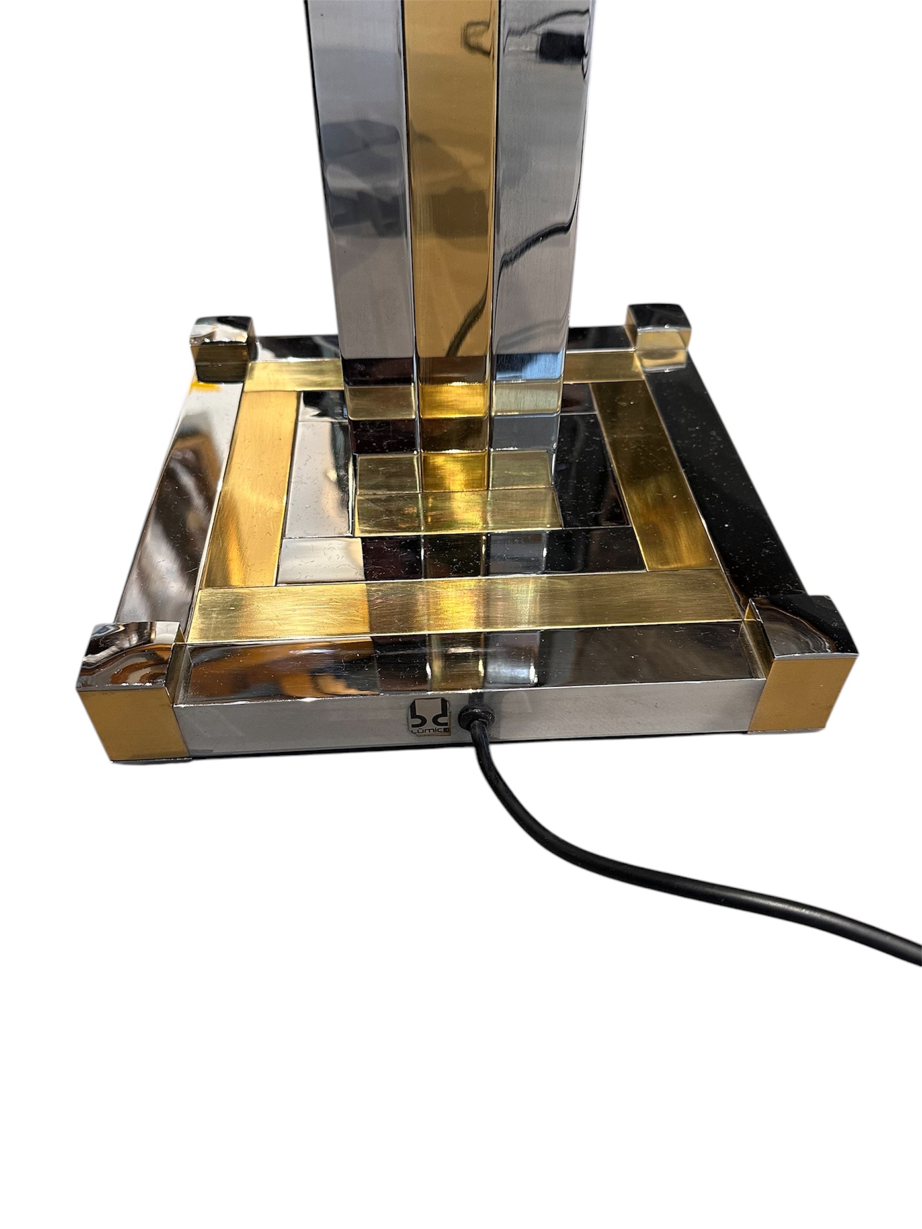 Candeeiro de pé com decoração geométrica em latão e metal cromado atribuído ao designer Willy Rizzo e fabricado pela BD Lumica em Barcelona, Espanha, na década de 1970.