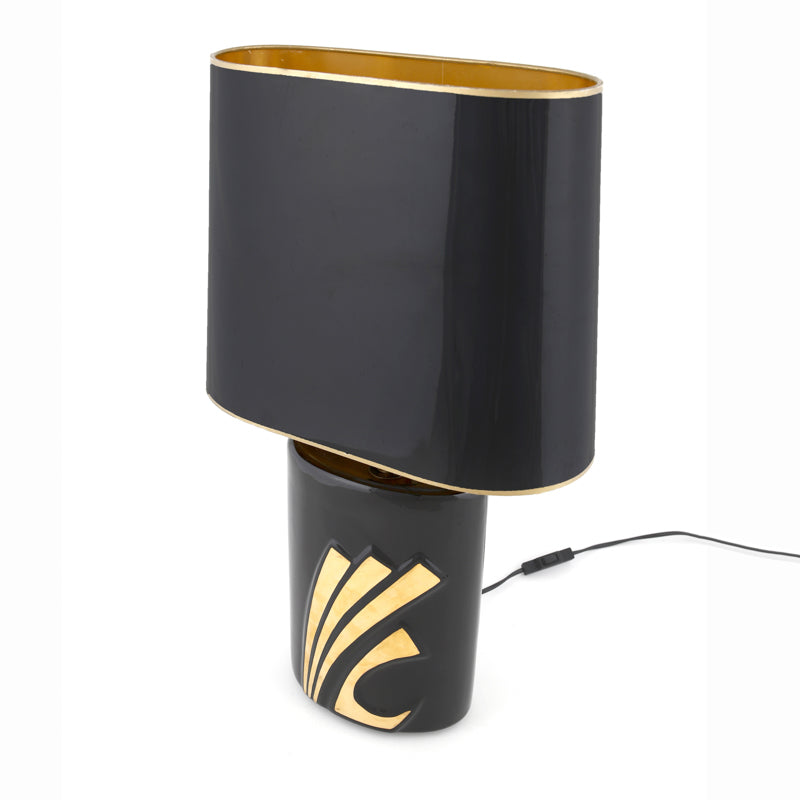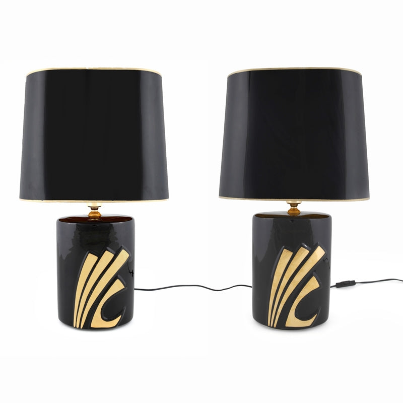 Par de candeeiros de mesa dos anos 70 em porcelana vidrada preta por EVE Collection. Feito à mão e banhado a ouro com abat-jour original feito em lâmina de policarbonato. Com selo da fábrica.