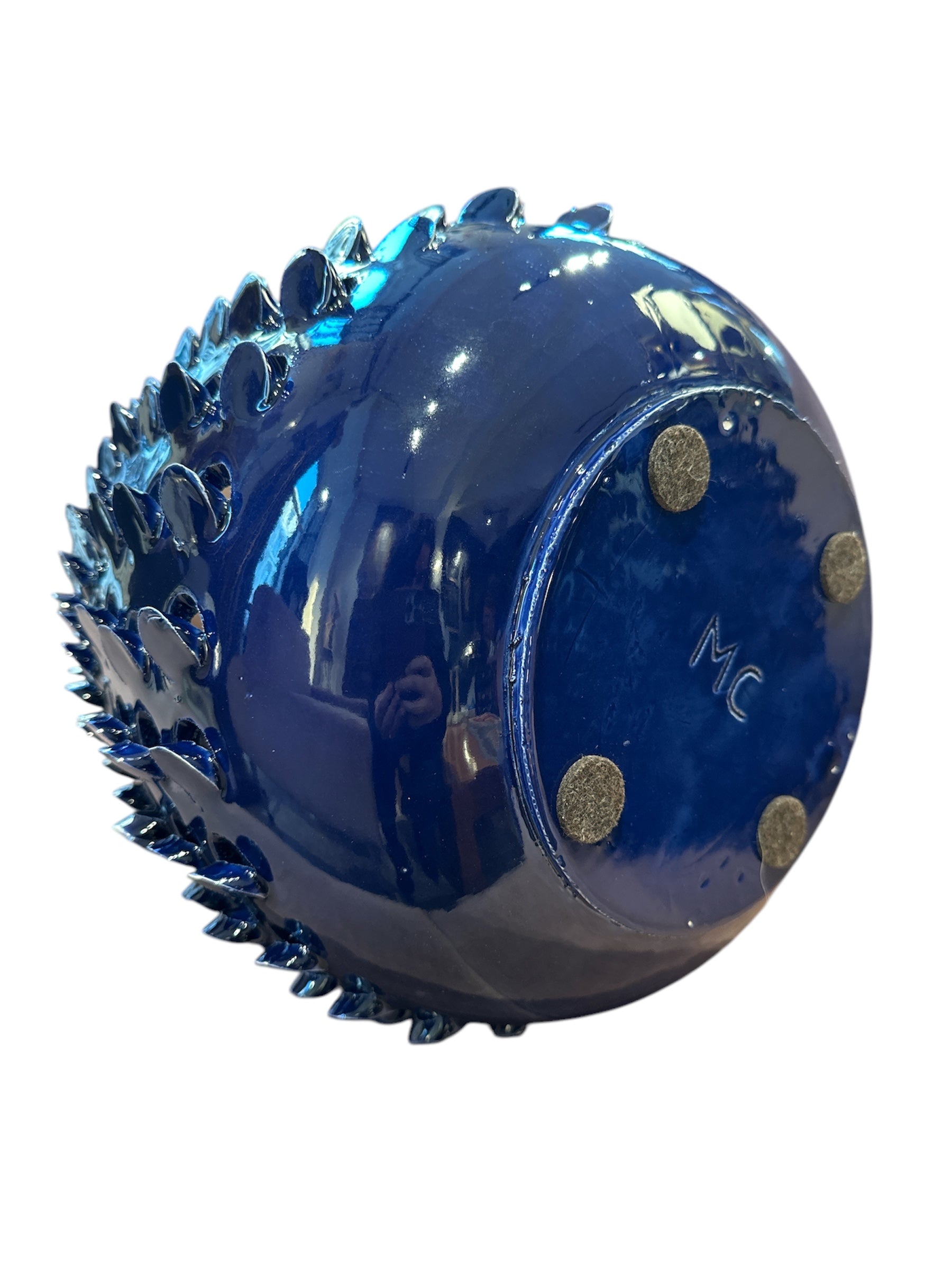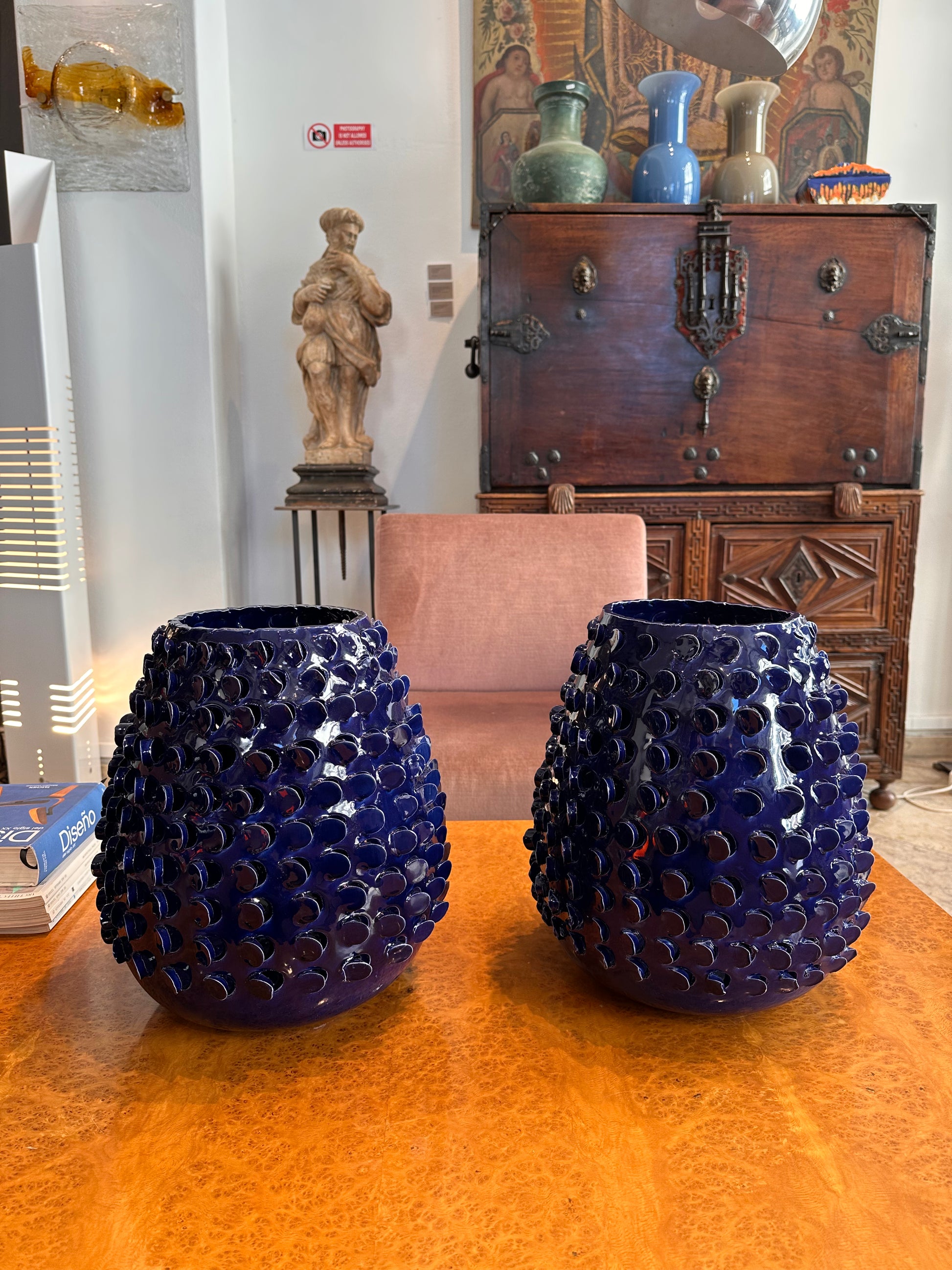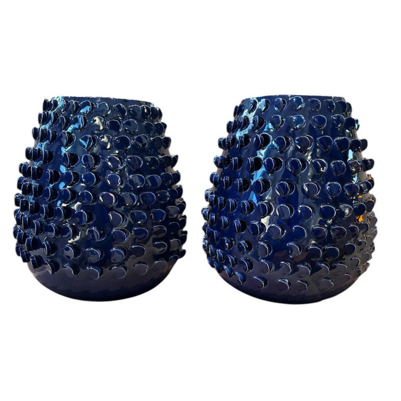 Par de vasos italianos em cerâmica vidrada azul, reproduzidos na década de 1980. MC assinado